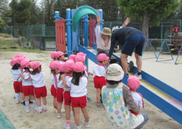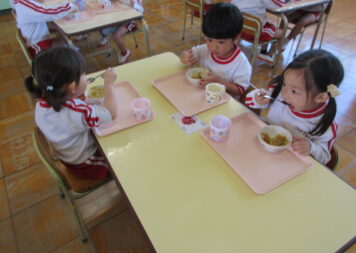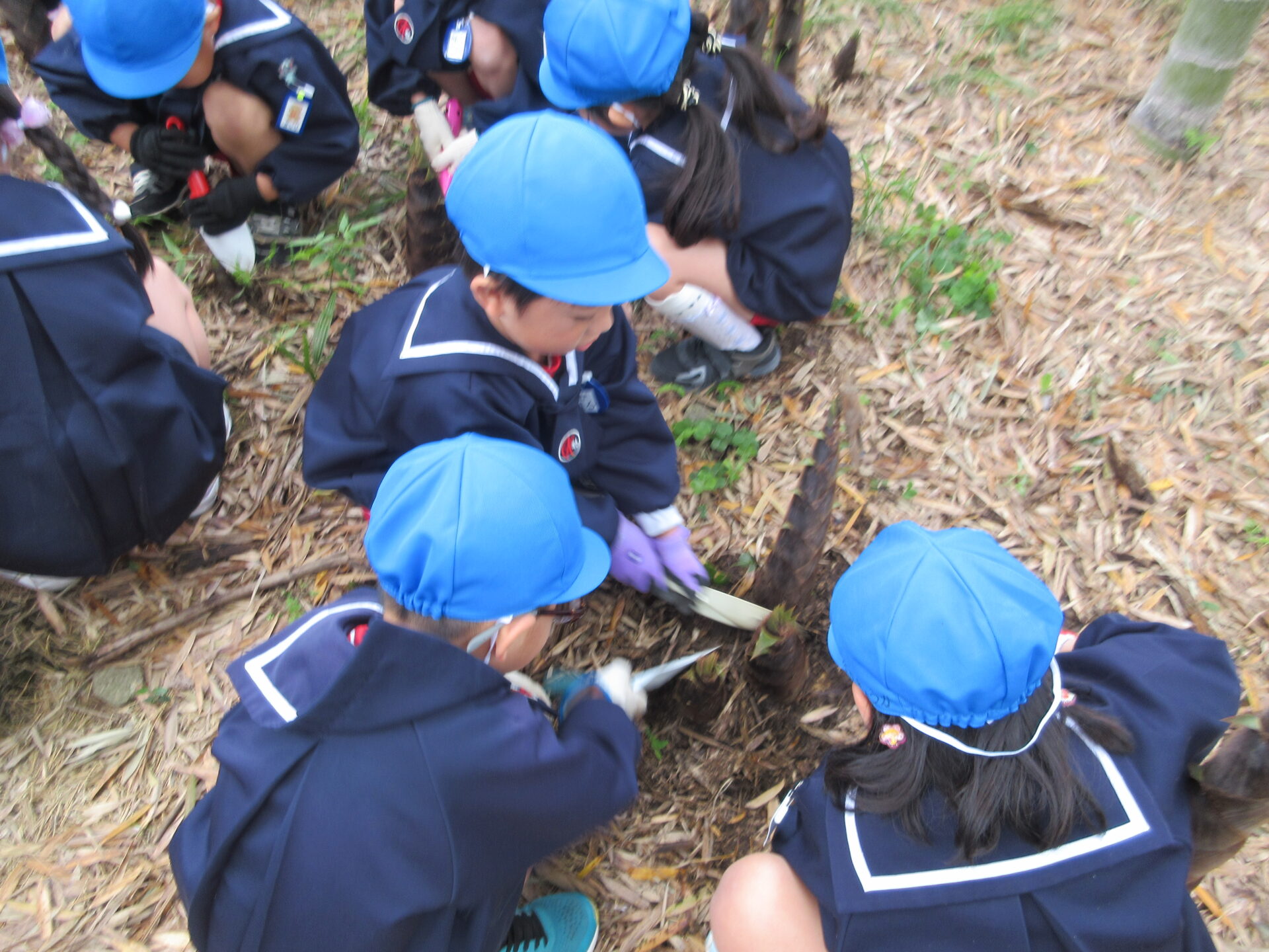 早朝に降った雨の影響で実施が心配されました年長さんのたけのこ掘りですが、予定通り行うことができました。竹林に着くと、土の中からたくさんのたけのこが顔を出していました。スコップを手に持ち、みんなで協力して少しずつ土を掘り起こし、たけのこを掘り出すことができましたね。