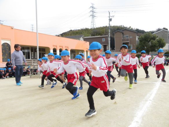 年長さんが幼稚園周辺の道路を使ってマラソン大会を行いました。周囲650mの沿道には多くの保護者の方の応援がありました。園庭では年中さん、年少さんが応援グッズを持って、声をからして応援しました。