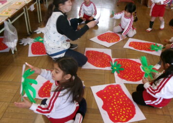 あけぼのっ子展へ向けて、作品作りも進みます。写真は、年少さんがイチゴの絵をかいているところです。
