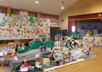 朝、マラソンでからだを動かした後、子どもたちは次々にできた作品を体育館に運び込んでいました。体育館は「あけぼのパークへようこそ」のテーマに沿った展示が進んでいます。