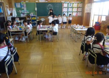 初夏を思わせる暖かい日でした。今日から1時降園になり、給食が始まりました。初日のメニューは「カレーライスとリンゴジュース」です。ほとんどの子が完食でした。