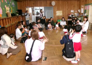 保育参観では、それぞれのクラスで歌を歌ったり、こいのぼりや紙コップを使ったおもちゃの製作をしたりしました。子どもたちは、お家の人と一緒にとっても楽しそうでした。
